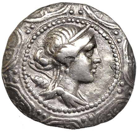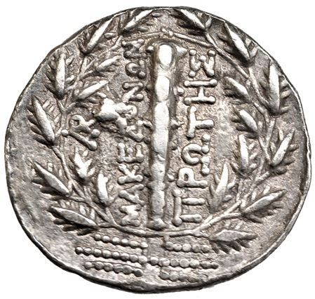 MACEDONIA. Tetradracma (158-150 a.C.). R/ Dentro de corona; maza , rayos a izq. encima monograma AP. AR 16,6, g. COP-1310. SBG-1386 vte. MBC.