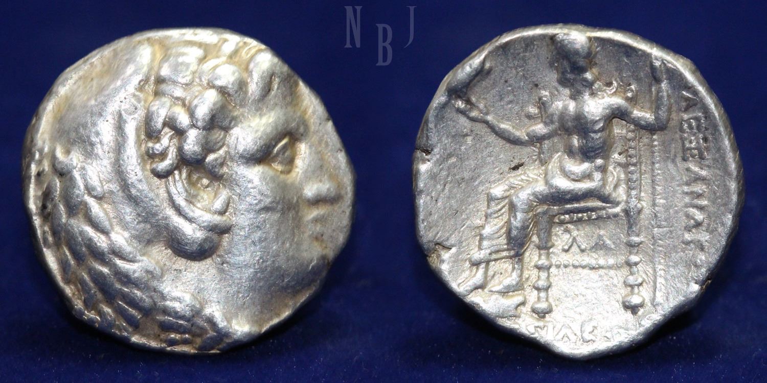MACEDONIAN KINGDOM: Alexander III the Great (336-323 BC). AR Tetradrachm. Head of Heracles right, wearing lion skin headdress. AΛEΞANΔPOY-BAΣIΛEΩΣ, Zeus enthroned left, right leg drawn back, feet on ground line, eagle in outstretched right hand, grounded scepter in left; monogram below throne. (17gm, 25mm) Very Fine.