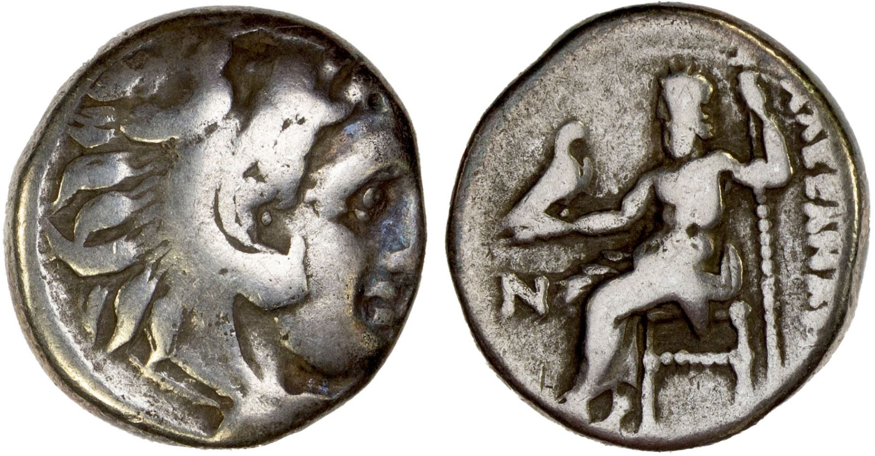 MACEDONIAN KINGDOM: Alexander III, the Great, 336-323 BC, AR drachm (4.17g), Kolophon, Price-1797, Muller-1322, struck 310-301 BC, head of Herakles right, wearing lion's skin headdress / AΛEΞANΔPOY, Zeus seated left on throne, holding eagle and scepter, N in left field, Fine