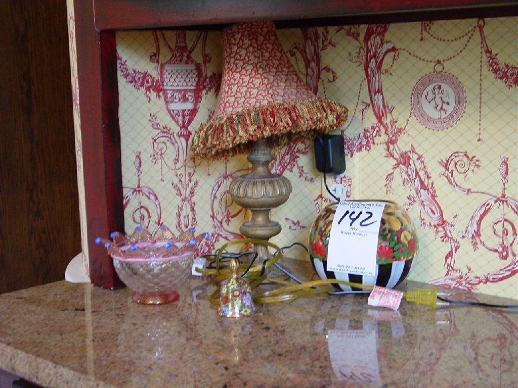 MACKENZIE CHILDS HAND CRAFTED GLASS CANDY DISH, BELL & LAMP (4X)