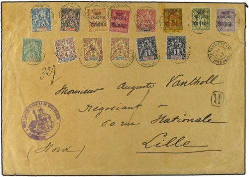 1897 Registered envelope to Lille franked 1895 French Post Office in Madagascar top five values to Fr.5 and 1896 ´& Dependencies´ to 50c. (9 values) tied by Tananarive datestamp. Obverse also bears Expeditionary Corps cachet.