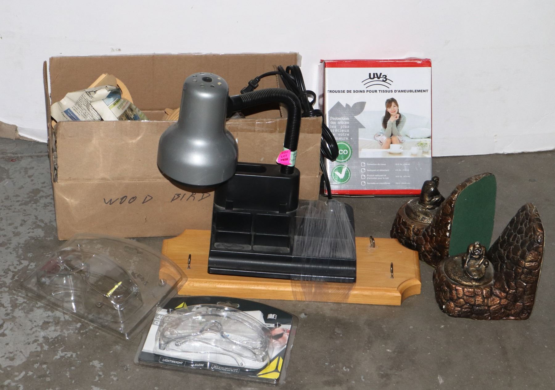 SOLD WITH WOOD BIRD DECORATION (SOME ASSEMBLY REQUIRED), TWO PAIRS OF SAFETY GLASSES, FURNITURE CLEANING KIT, LAMP, AND MORE