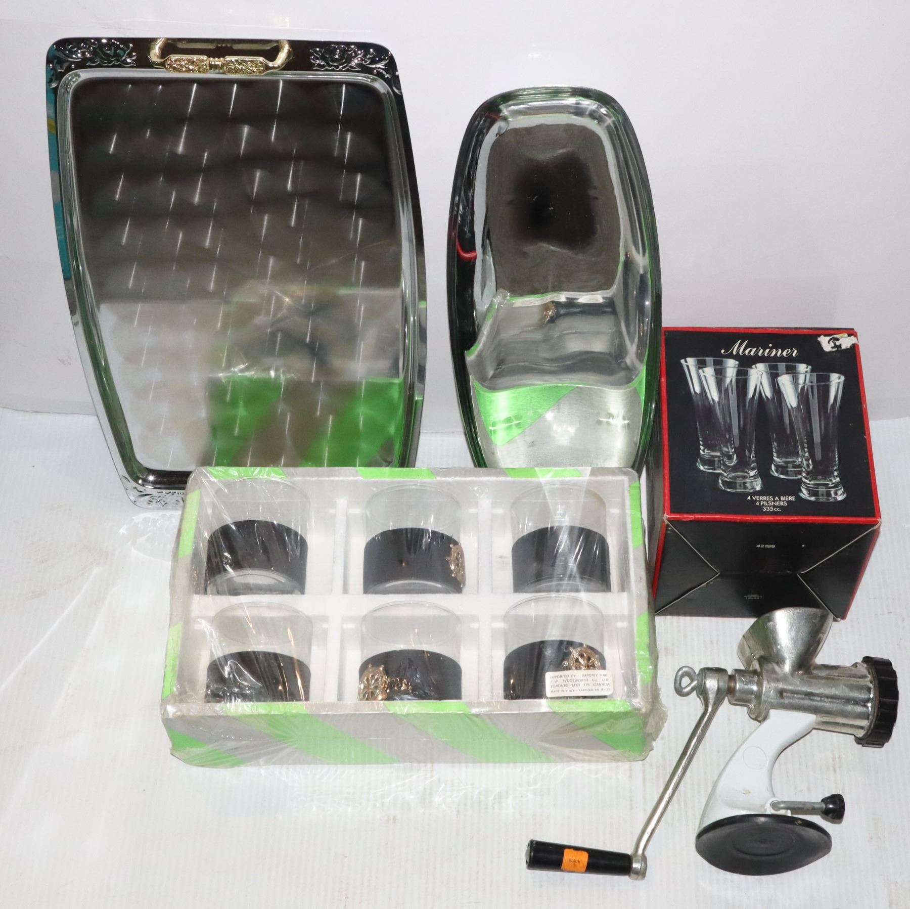 TRAYS, 4 PILSNER GLASSES, 6 ITALIAN GLASSES NOS