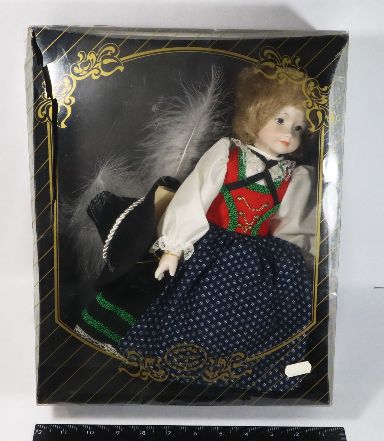 PORCELAIN DOLL IN BOX. SOME DAMAGE TO BOX