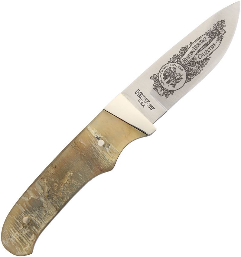 Overall: 8.125"; Blade: 3.75" l Stainless l Standard Edge l Satin Finish; Other Info: Full Tang. Hunting Heritage Collection blade artwork. Ram's horn handles with brass guard. Black leather belt sheath