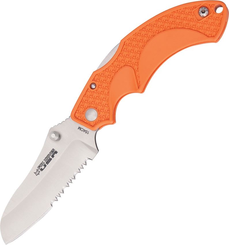 4 5/8" closed lockback. 3 1/2" 154CM stainless partially serrated sheepsfoot blade with dual thumb studs and thumb ridge. Orange fingergrooved FRN handles. Lanyard hole. Stainless pocket clip