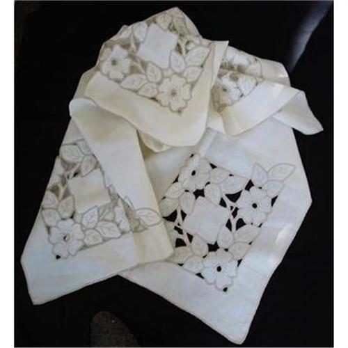 LOVELY VINTAGE MADEIRA TABLECLOTH, COMES IN PRETTY WHEAT COLOR AND SHADE OR TWO DARKER EMBROIDERY - PLEASE NOTE THE MOST EXTENSIVE CUTWORK WHICH DEMOSTRATES EXCELLENT WORKMANSHIP,i examened this tablecloth and could not find anything wrong with it, It seems to be in Excellent condition - Measures about 42" 1/2" x 41",US Buyer to pay 7.00 for shipping plus insurance.THANKS.