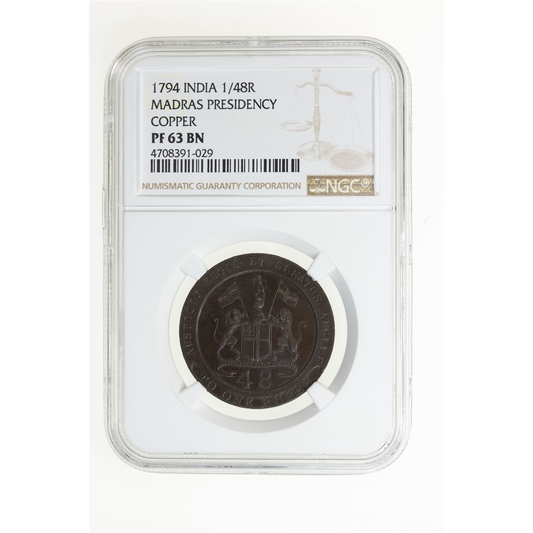 MADRAS PRESIDENCY: AE 1/48 rupee, Soho mint, 1794, KM-394, Stv-5.167, East India Company issue, NGC graded PF63 BR.