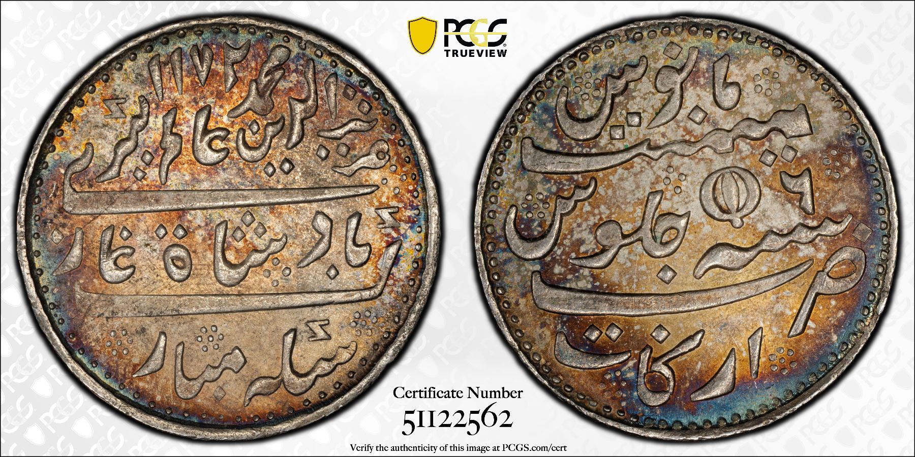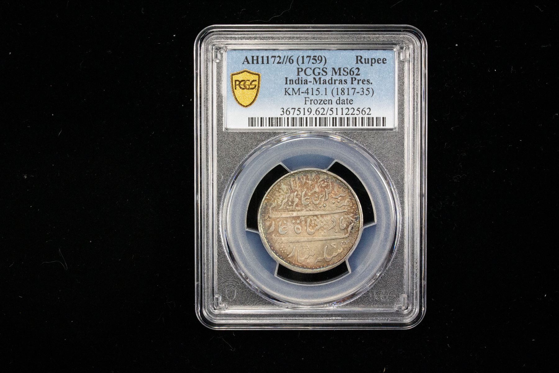MADRAS PRESIDENCY: AR rupee, Arkat, AH1172 year 6, KM-415.1, East India Company issue, in the name of Alamgir II, closed lotus as a mint mark, indented cord milling, struck at the Madras mint, a pleasing mint state example, PCGS graded MS62.