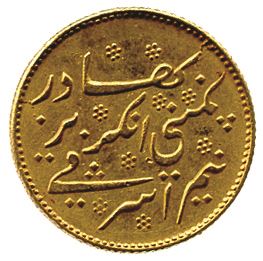 MADRAS PRESIDENCY: AV ½ ashrafi (5.84g), ND (1819), KM-420, Prid-242, VF to EF, R. The East India Company asked for and received permission to strike their own Arcot rupees. Later, coins of several metals were added. The Madras mint closed in 1869.