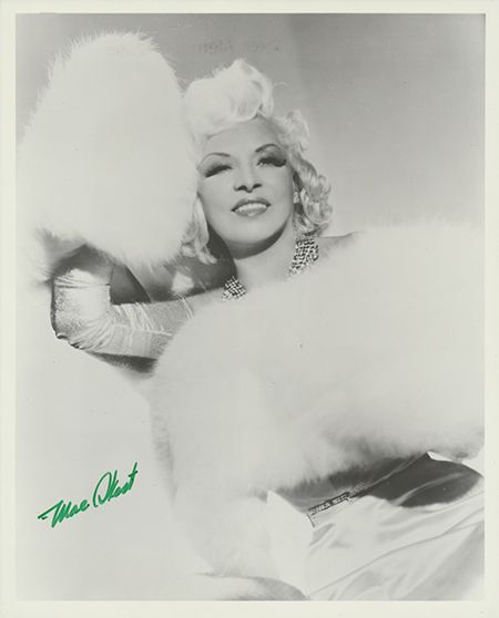 (1892 - 1988) American film actress, a sultry, flirtatious, and controversial star of her time. S.P. 8" x 10" b/w, a reprint of a vintage image showing Mae luxuriating in white fur. Boldly signed in green marker, fine condition.