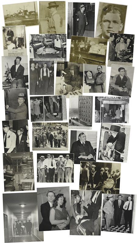 Excellent group of 43 original wire photographs of criminals, Mafiosi, crime scenes and mayhem spanning the years from the Twenties to the Sixties, showing many of the most notorious figures of all time. Included is: Prohibition agents raid illegal liquor still, dump mash on front lawn (1920s original), 5x9 in.; Shipment of liquor arrives by boat during Prohibition, reserved for foreign dignitaries (1920s) 5x9 in.; "Traveling Barroom Seized" for violating Volstead Act; flasks resemble life vest (1920s orig.) 5x9 in.; Agents test bootleg beer in NYC, declare it as good as before Prohibition (1920s orig.) 5x9 in.; Wife of Legs Diamond leaves hospital in tears after hearing his last words 1930 5x9 in.; Targeting gangster vice and crooked politicians, Samuel Seabury arrives at Governor's Office 1930 7x9 in.; Mayor of NYC, Jimmy Walker, was target of Seabury Commission and resigned (undated orig.) 7x9 in.; Portrait of the Jurors hearing the trial of Al Capone on income tax evasion charges 1931 8x10 in.; NYC Arrest photograph of Vincent Coll, killed by bootlegger Dutch Schultz 1932 5x9 in.; Roger Touhy gang led to face charges they kidnapped brewer William Hamm Jr. 1933 7x9 in.; "Three Finger" Jack White Shot Down in lavish Chicago apartment 1934 7x9 in.; Jess Doyle in custody on suspicion he participated in kidnapping of banker Edward Bremer 1935 7x9 in.; John Dillinger led by Police to a lineup, identified as killer of Policeman in Chicago (1930s original); Dillinger's machinegun, bulletproof vest, .45 Colt and ammunition recovered after his death 1934 7x9 in.; Thompson submachine gun recovered from Pretty Boy Floyd's car after his death (undated orig.) 7.5x9 in.; Barker Gang's Alvin Karpis and co-defendant led to trial for kidnapping William Hamm Jr. 1936 7x9 in.; NYC strikebreaker Sam "Chowderhead" Cohen appears before labor panel 1936 7x9 in.; Prison cell occupied by Richard Loeb after he was slain by fellow inmate 1936 5x7 in.; Dutch Schultz lawyer Richard "Dixie" Davis leaves jail to visit dentist 1938 5x9 in.; Police Chief in Puerto Rico holds Dillinger death mask, 1939 7x9 in.; Reles target Louis "Lepke" Buchalter smiles in handcuffs after surrendering 1939 5x9 in.; Informant Abe Reles smiles after missing date to testify against Bugsy Siegel in 1940 5x9 in.; Abe Reles death plunge diagram of Half Moon Hotel exterior 1941 (w Police & dead body) 8x11 in.; The body of Abe Reles carried by NYPD to the morgue wagon 1941 5x9 in.; Wife of Abe "Kid Twist" Reles weeps at his burial in Brooklyn 1941 8x11 in.; Bugsy girl Virginia Hill is locked out of her house by Treasury agents (undated original) 8x10 in.; Bugsy Siegel murder witness Allen Smiley acquitted of assault, poses with Tommy Dorsey & wife 7x9 in.; Bugsy Siegel underboss Mickey Cohen forced to sell his gun collection to pay lawyers 1951 8x10 in.; Address where Willie Sutton lived when fingered by civilian do-gooder Arnold Schuster 1952 7x9 in.; Willie Sutton is held on charges of possessing revolver found at his rooming house 1952 8x10 in.; Diagram of spot where Arnold Schuster was shot and killed on orders from Albert Anastasia 7x9 in.; Albert Anastasia stands with his legal counsel after pleading guilty to tax evasion 1955 7x8 in.; Albert Anastasia is rolled over by NYPD detectives after his barbershop murder 1957 7x8 in.; Albert Anastasia's body lies prone and covered with a sheet in Arthur Grasso barbershop 1957 7x9 in.; Rackets figure Johnny Dio pleads Fifth after slugging newspaper cameraman 1957 7x9 in.; Ex-Boxer, Ex-Con and hijacker Leo Milito shot down on Lower East Side 1958 7x9 in.; Arrested at Apalachin, Paul Castellano arrives at NYC courthouse 1959 8x10 in.; Bugsy murder suspect Mickey Cohen is led in handcuffs to Alcatraz Island 1962 6x9 in.; Lee Harvey Oswald, in pain from gunshot, is taken by stretcher to Parkland Hospital 1963 5x9 in.; Jack Ruby all smiles in a portrait with a Carousel Club showgirl taken year before shooting 1963 7x9 in.; Crowd in Dealey Plaza cheers upon hearing Ruby shot Oswald (photo by Eamon Kennedy 1963) 8x10 in.; Lee Harvey Oswald's body escorted by Sheriff's Department (photo by Eamon Kennedy 1963) 8x10 in; Mafia figure Santo Trafficante leaves jail after arrest at Queens, NYC restaurant 1966 7x9 in. All in generally very good to fine condition. A nearly impossible grouping to assemble.