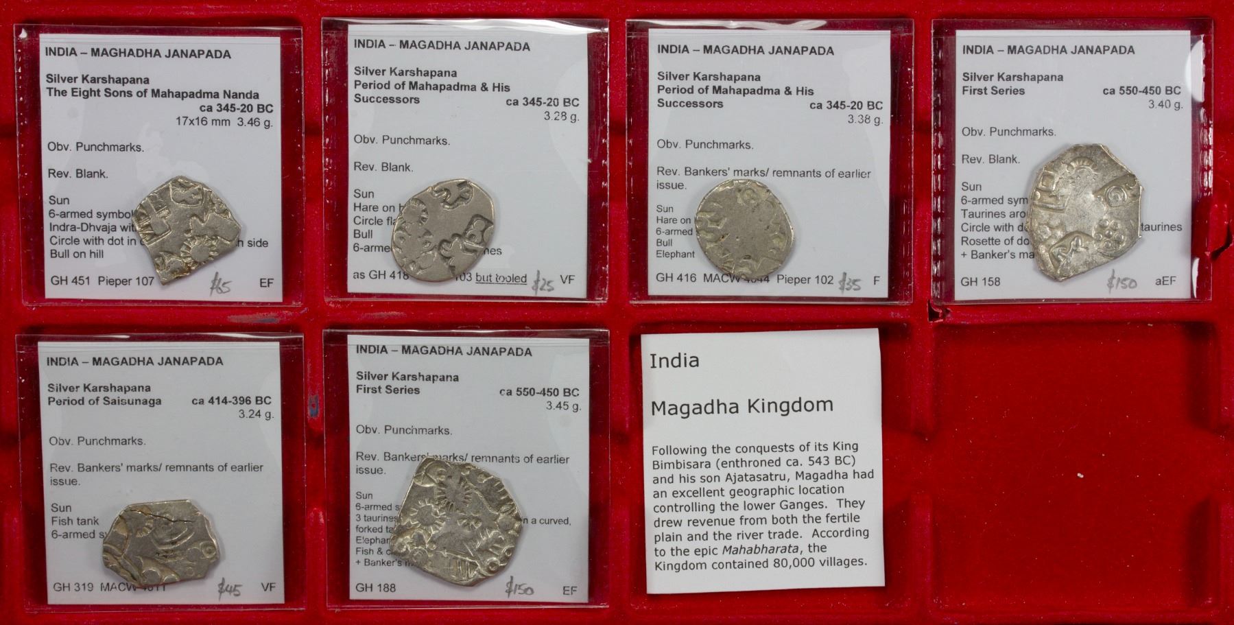 MAGADHA: LOT of 6 punchmarked silver coins, various type, 5th-4th century BC, weight 3.40g, 3.45g, 3.24g, 3.38g, 3.28g, and 3.46g; average VF condition; all with Todd's full description; retail value $325, lot of 6 pieces, ex Ian Todd Collection.