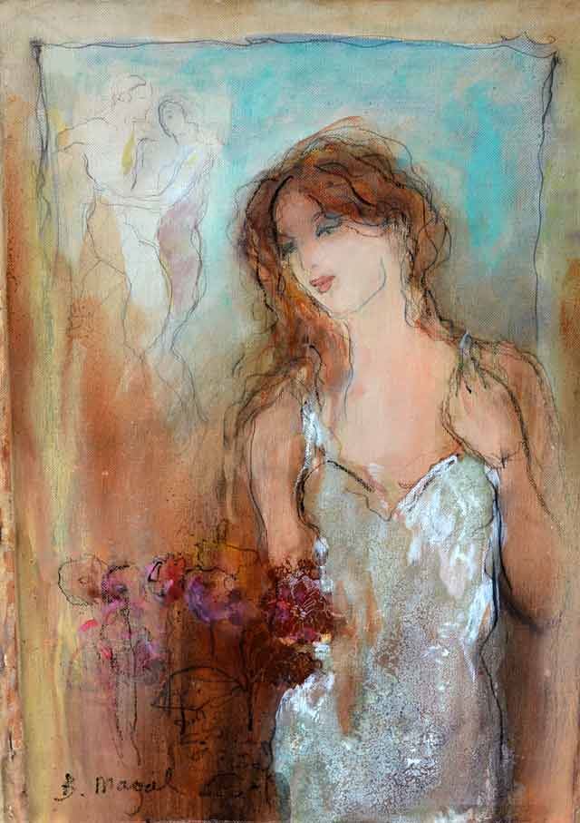 MAGAL **THE LONGING ** SIGNED ORIGINAL OIL. Artist: Batia Magal (b. 1953) - Title: The Longing - Medium: Original Oil on Canvas - Signature: This one-of-a-kind work is hand-signed by the artist at the bottom of the image - Image Size: Approximately 23.5 inches x 15 ¼ inches - Framed: Unframed on Unstretched Canvas - Details: This work comes with a Certificate of Authenticity - Biography: Batia Magal was born in Israel in 1953. From childhood onwards, she displayed a marked talent for drawing and an all embracing love for art. It is therefore not surprising that after finishing high school, she attended the Avni Art Institute. Her work seems to have developed along various lines, all of which converged and fused into a very personal and feminine statement. - Magal originals have sold for more than $10,000.00 - Warranty: Item GUARANTEED to be as described