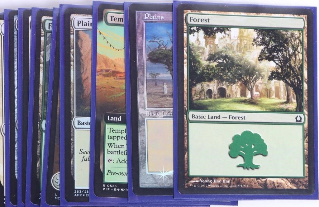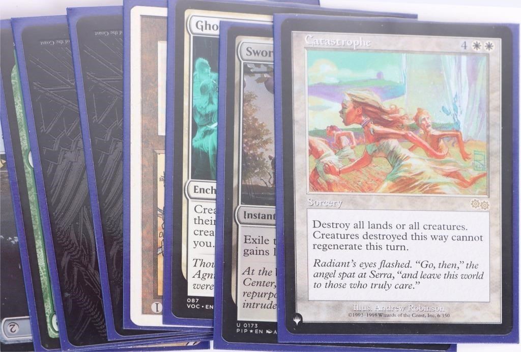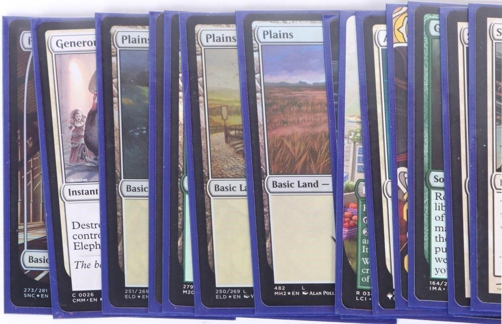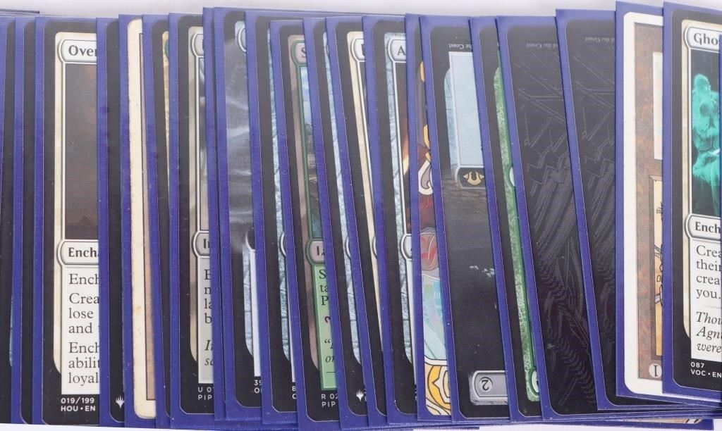 Approximately 100 Magic The Gathering cards in various conditions featuring various foil and non-foil cards including rarre cards such as Humility, Drannith Magistrate, Avacyn, Smothering Tithe, and Replenish.