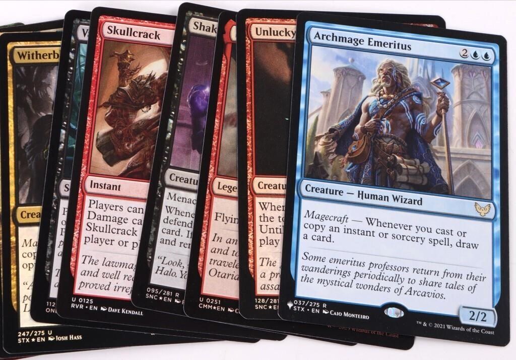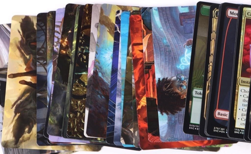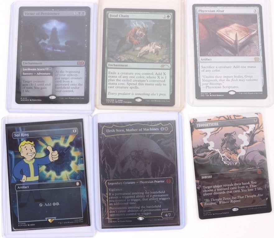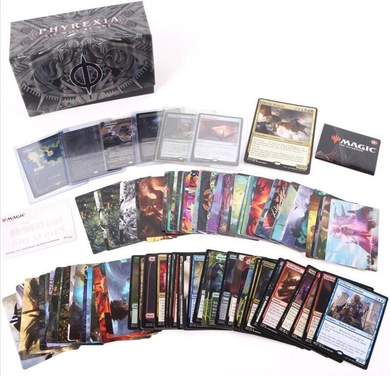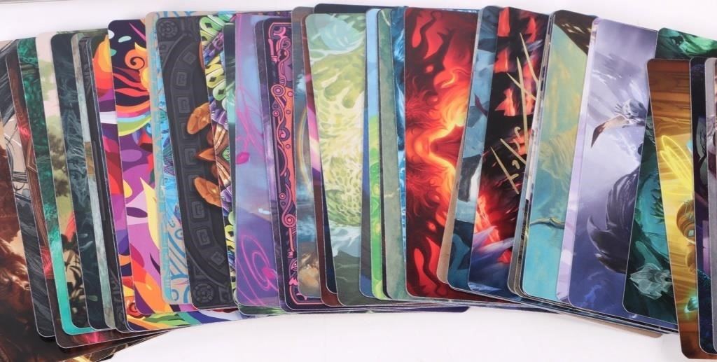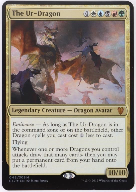 Lot of various magic the gathering cards including foil rare and mythic cards as well as art cards and an oversized Ur Dragon card as well.