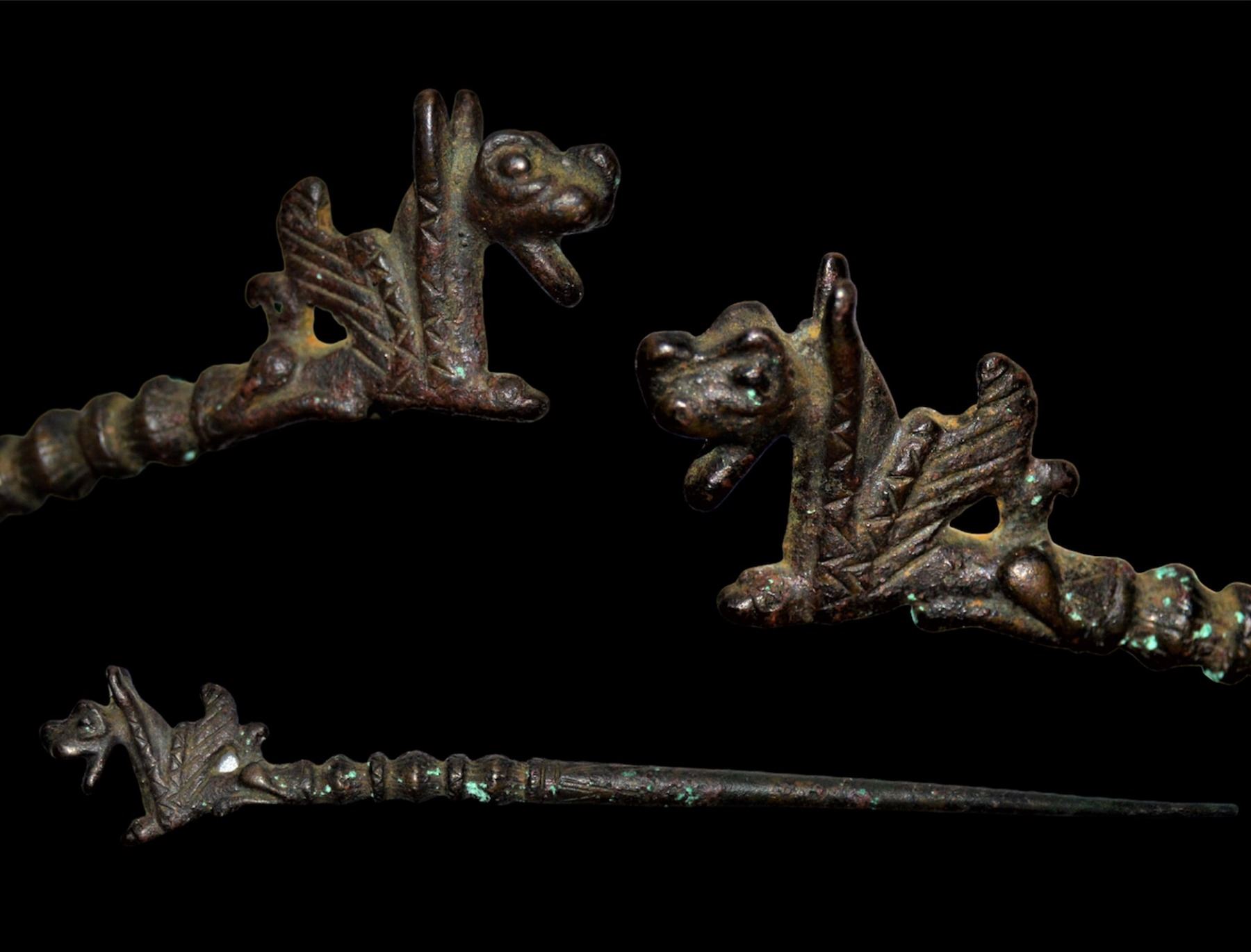 A Magnificent & Rare Ancient Luristan/Greek Bronze Pin ARTISTIC WORK, Circa Early 1st Millennium B.C. , With terminals in the form of stylised winged