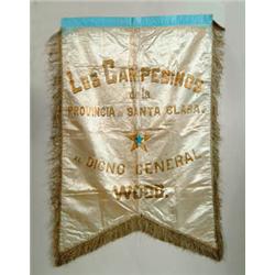MAGNIFICENT AND HISTORIC BANNER GIVEN TO MAJOR GENERAL LEONARD WOOD, COMMANDER OF THE “ROUGH RIDERS,” MILITARY GOVERNOR OF CUBA AND MEDAL OF HONOR WINNER. This lot consists of a photograph of General Wood in uniform, various records of his career and a wonderful silk banner presented to him by the people of Cuba following his service as Military Governor. The swallowtail banner is fashioned of silver colored silk with gilt cloth fringe measuring 31” x 45” with a gold painted legend reading “Los Canpesinos/de la/PROVINCIA de SANTA CLARA/ al DIGNO GENERAL/WOOD.” A large five pointed star with a small blue 5-pointed star is painted in the center. The top is reinforced with a new blue nylon loop for a pole and some modern repairs have been worked in the corners where separation has occurred. The photograph is a 3/4 standing view of General Wood, early in his career, in full dress uniform. Accompanying the group is a history of his career and information regarding his burial (and family member grave sites) in Arlington National Cemetery. Wood was born in New Hampshire in 1860. He graduated from the Harvard Medical School in 1883. He accepted a position with the U.S. Army as a physician in 1883 and was assigned to Fort Huachuca, Arizona. During the last campaign against Geronimo, Wood voluntarily carried dispatches a distance of some 100 miles through hostile territory, riding over 70 miles in one day and walking nearly 30 miles the next. For several weeks. While in close pursuit of Geronimo, he commanded a detachment of Infantry. For his actions he was awarded the Medal of Honor in 1898. He went on the serve the Army in a number of medical positions and was chosen to be the personal physician to President William McKinley. During the War with Spain he pursued line responsibility and was given command of the 1st Volunteer Cavalry. His second in command was Theodore Roosevelt. General Wood led his regiment, soon to be known as the “Rough Riders” at Las Guiasimas and San Juan Hill. He led the 2nd Volunteer Cavalry for the remainder of the war. Following the end of the war, Wood remained in Cuba and was appointed the Military Governor from 1900-1902. Before leaving this post he received a commission as Brigadier General. After 1902 he became Commander of the Philippines division, Commander of the Department of the East and, in 1910, he was named chief of Staff of the Army, the first medical officer to ever hold that post. His contributions to army organization and command are noteworthy. General Wood trained the 89th and 10th Infantry Divisions for World War I and accepted a promotion to Major General. He ran for the Republican nomination for President in 1920 but was beaten by Warren Harding. He retired from the Army in 1921 to become the governor General of the Philippines until 1927. This banner and the photograph represent just one aspect of a brilliant military career and a treasured artifact directly related to a heroic soldier and Medal of Honor winner. CONDITION: The banner is very presentable and makes a nice appearance. The modern addition of a nylon band at the top and the repairs surrounding it are neatly done, but detract from the originality of the piece. It makes a very nice display and is related to one of the U.S. Army’s most heroic and famous officers. 4-51398 CW10