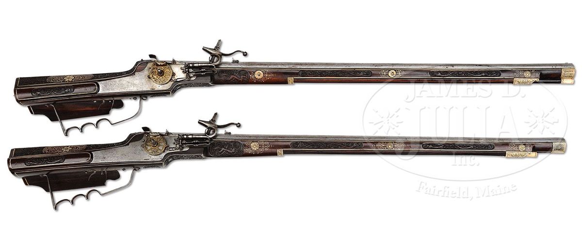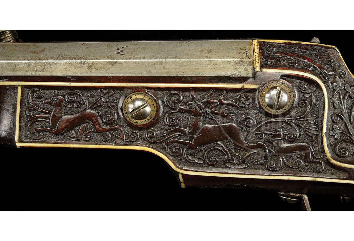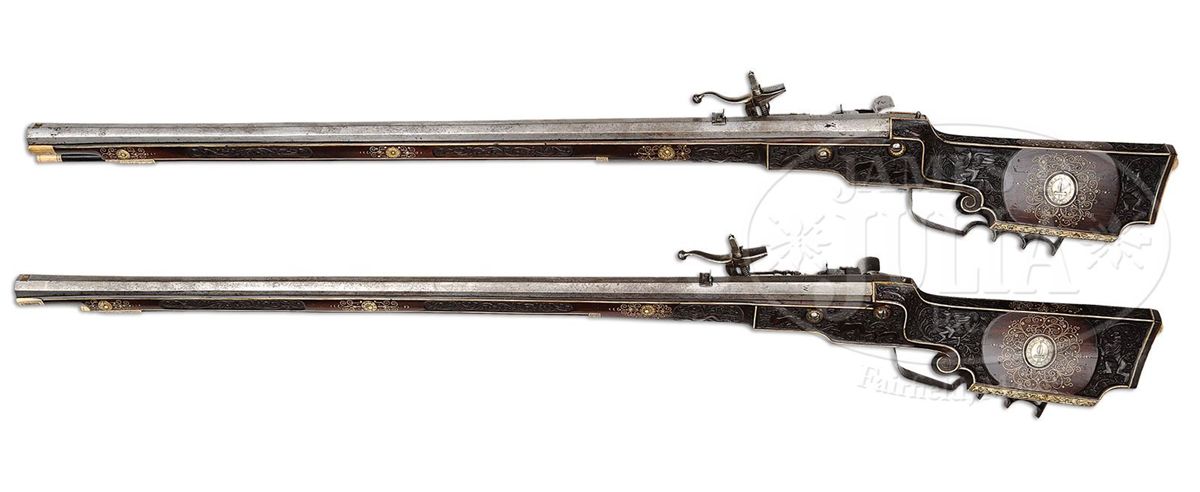 MAGNIFICENT AND UNIQUE PAIR OF WHEEL LOCK RIFLES BY THE MEISTER DER TIERKOPFRANKE SIGNED "MSH", DATE