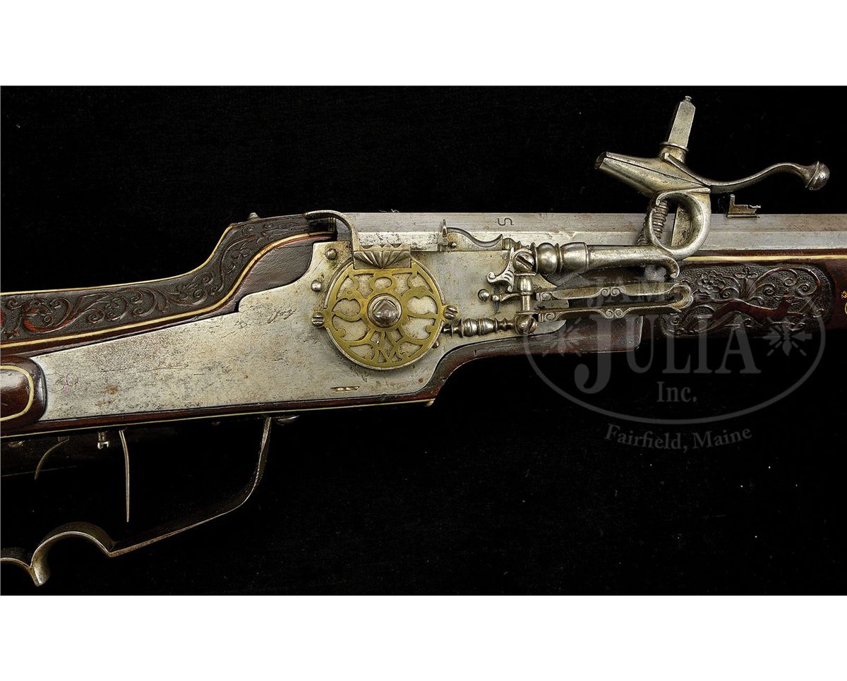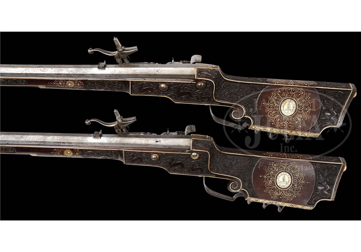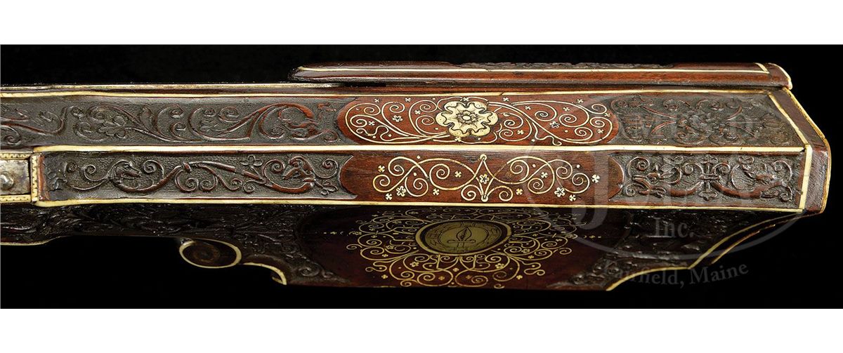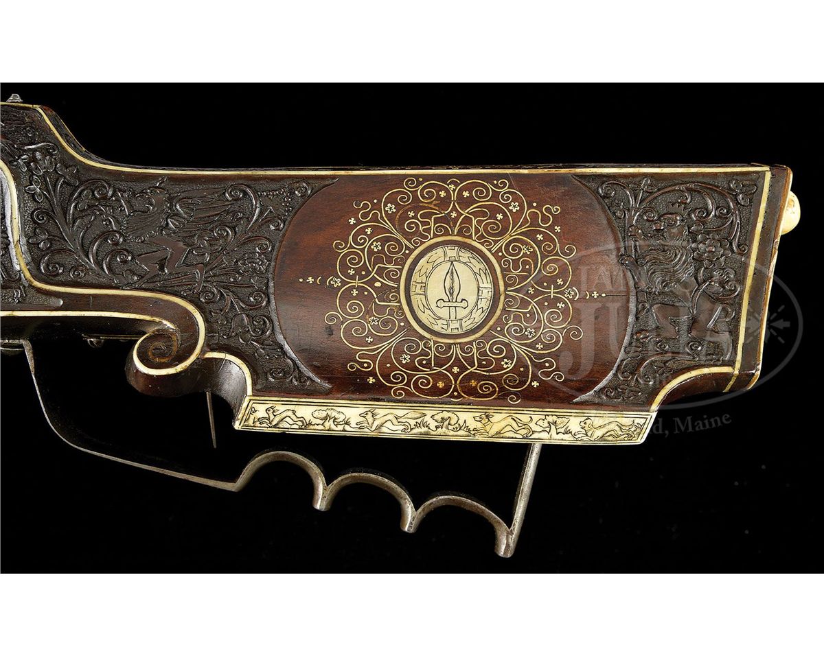 NSN. Listed in the article on the Master of the Animal Scrolls by Dr. Hans Schedlemann as being in the collection of his Majesty, King Leopold of Belgium. This pair of rifles represents an unparalleled offering to collectors of high art wheel lock rifles. Emanating directly from a royal collection, their pedigree and provenance is guaranteed. Locks are relatively plain and austere. Wheel covers pierced with two mythical figures and the dog spring finely filed. Dog itself is sculpted in plain steel. Oct bbls are rifled with two leaf rear sight and brass fore sight. Dated on the flats "1631". "M" on right flat, "S" on left flat, "H" on tang. Stocks of these rifles are superbly carved with winged griffons, a crowned lion indicative of royal pedigree, serpents, stag, hounds, and florals in high relief. Quality of the carving and condition almost appears to be molded, the carving is that good. Heightening the artistic effect of these marvelous rifles is white stag horn beautifully scrimshawed and white stag horn curls. Cheekpiece features a mother of pearl rondel scrimshawed with a spear surrounded by white stag horn pearls and stars. Patchbox is carved with two heads spewing from florals. NOTES: Often weapons are referred to as fit for royalty. This extraordinary pair of wheel lock rifles actually belonged to the King of Belgium. PROVENANCE: Austrian private collection. Collection of His Majesty King Leopold of Belgium as of 1973. Collection of Dr. Douglas Sirkin. Publication: "Arms & Armor" by Robert Held pg 186, figs 8a & 8b. Text pg 189 #8. CONDITION: Overall condition is virtually identical and exactly what one would expect from weapons having been stored in a royal collection. Lock is bright polished with no discernible erosion or pitting. Bbls exhibit staining but no erosion or pitting. Condition of stock inlay and carving would be characterized as pristine, untouched with only a few minor storage dents that do not detract from the miraculous condition of these rifles. Any pair of decorated wheel lock pistols is rare, but pairs of decorated wheel lock rifles are almost non-existent. 4-50125 MZ22