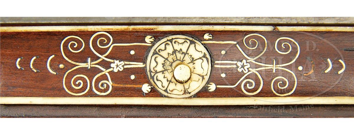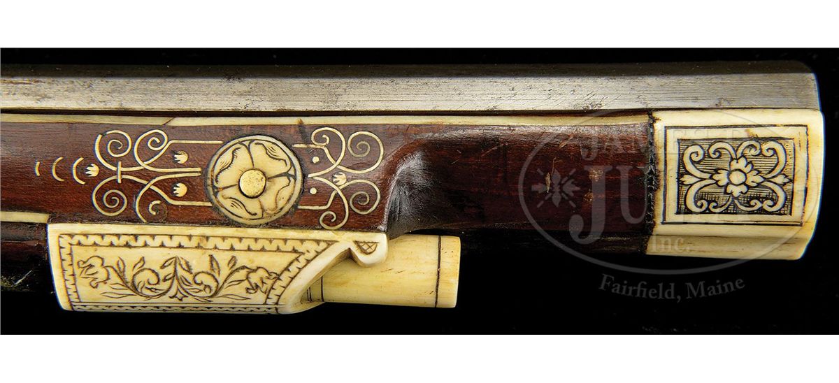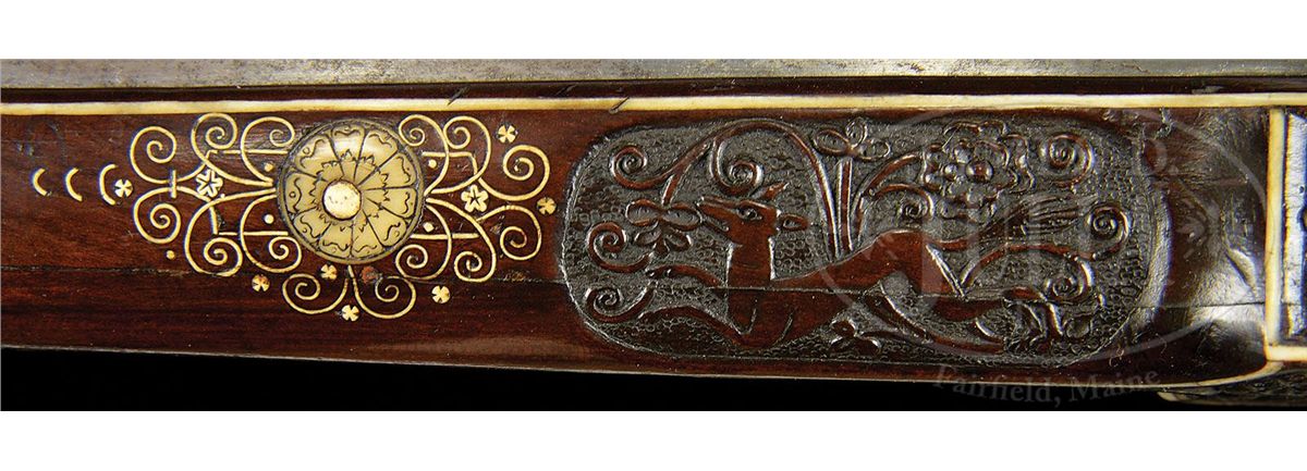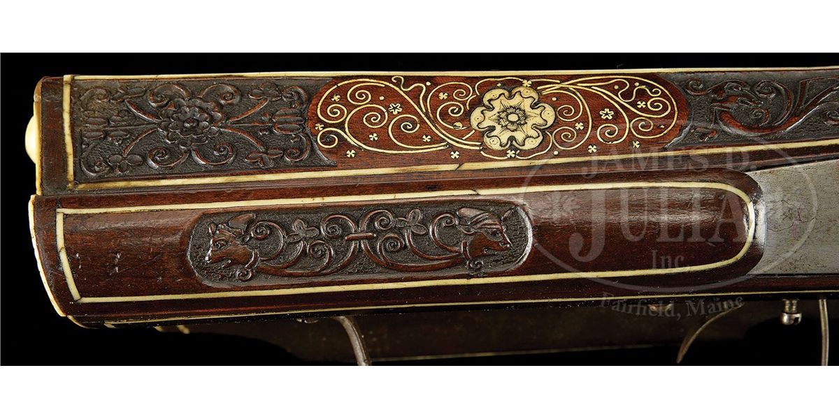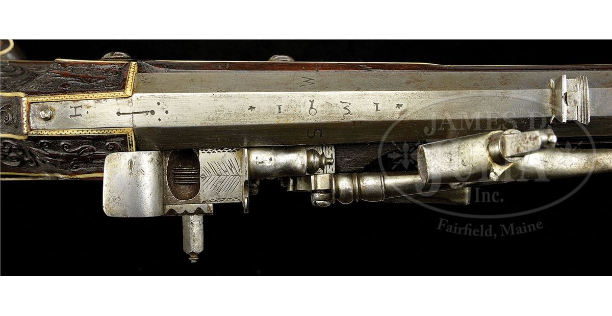 NSN. Listed in the article on the Master of the Animal Scrolls by Dr. Hans Schedlemann as being in the collection of his Majesty, King Leopold of Belgium. This pair of rifles represents an unparalleled offering to collectors of high art wheel lock rifles. Emanating directly from a royal collection, their pedigree and provenance is guaranteed. Locks are relatively plain and austere. Wheel covers pierced with two mythical figures and the dog spring finely filed. Dog itself is sculpted in plain steel. Oct bbls are rifled with two leaf rear sight and brass fore sight. Dated on the flats "1631". "M" on right flat, "S" on left flat, "H" on tang. Stocks of these rifles are superbly carved with winged griffons, a crowned lion indicative of royal pedigree, serpents, stag, hounds, and florals in high relief. Quality of the carving and condition almost appears to be molded, the carving is that good. Heightening the artistic effect of these marvelous rifles is white stag horn beautifully scrimshawed and white stag horn curls. Cheekpiece features a mother of pearl rondel scrimshawed with a spear surrounded by white stag horn pearls and stars. Patchbox is carved with two heads spewing from florals. NOTES: Often weapons are referred to as fit for royalty. This extraordinary pair of wheel lock rifles actually belonged to the King of Belgium. PROVENANCE: Austrian private collection. Collection of His Majesty King Leopold of Belgium as of 1973. Collection of Dr. Douglas Sirkin. Publication: "Arms & Armor" by Robert Held pg 186, figs 8a & 8b. Text pg 189 #8. CONDITION: Overall condition is virtually identical and exactly what one would expect from weapons having been stored in a royal collection. Lock is bright polished with no discernible erosion or pitting. Bbls exhibit staining but no erosion or pitting. Condition of stock inlay and carving would be characterized as pristine, untouched with only a few minor storage dents that do not detract from the miraculous condition of these rifles. Any pair of decorated wheel lock pistols is rare, but pairs of decorated wheel lock rifles are almost non-existent. 4-50125 MZ22