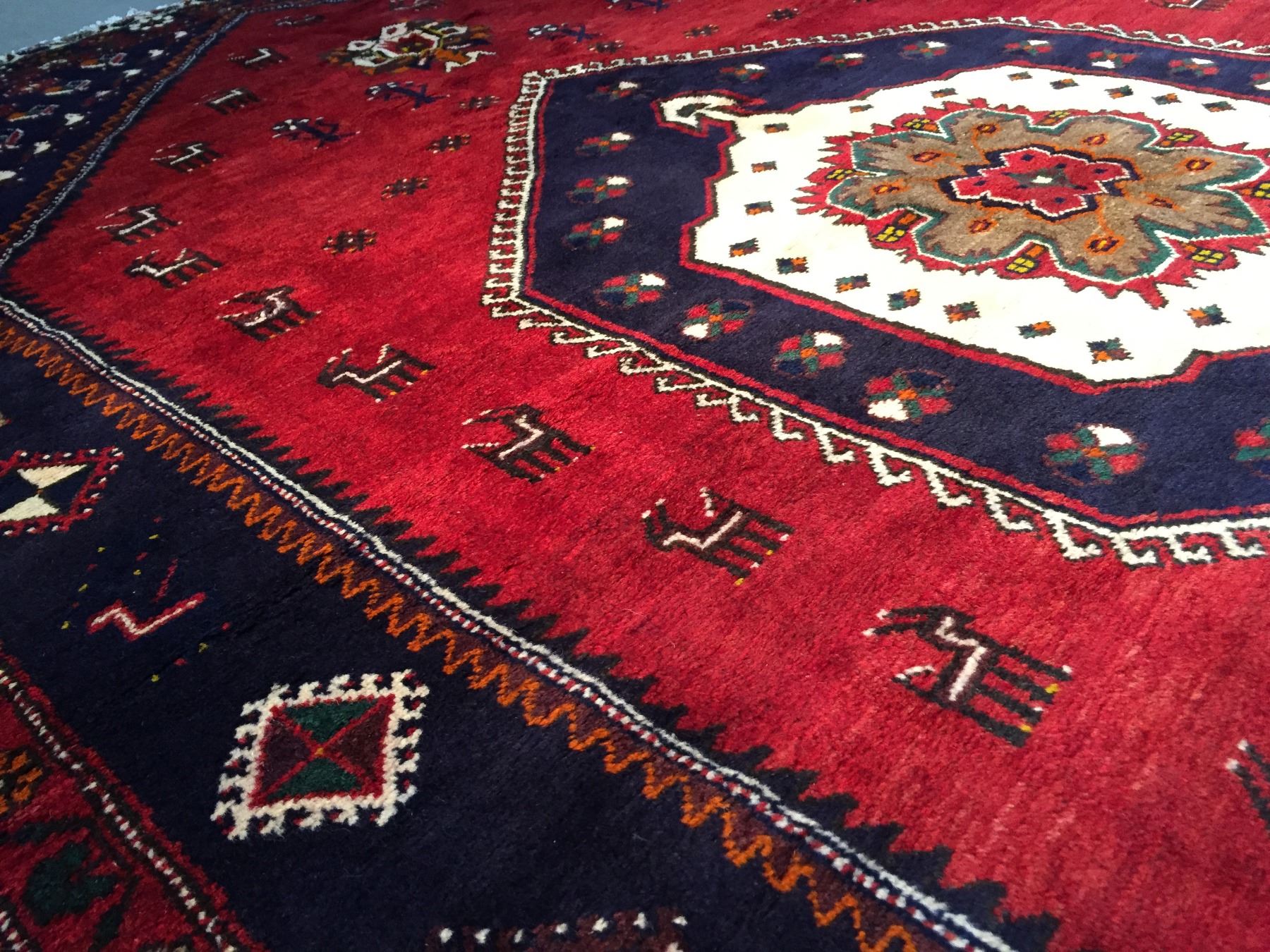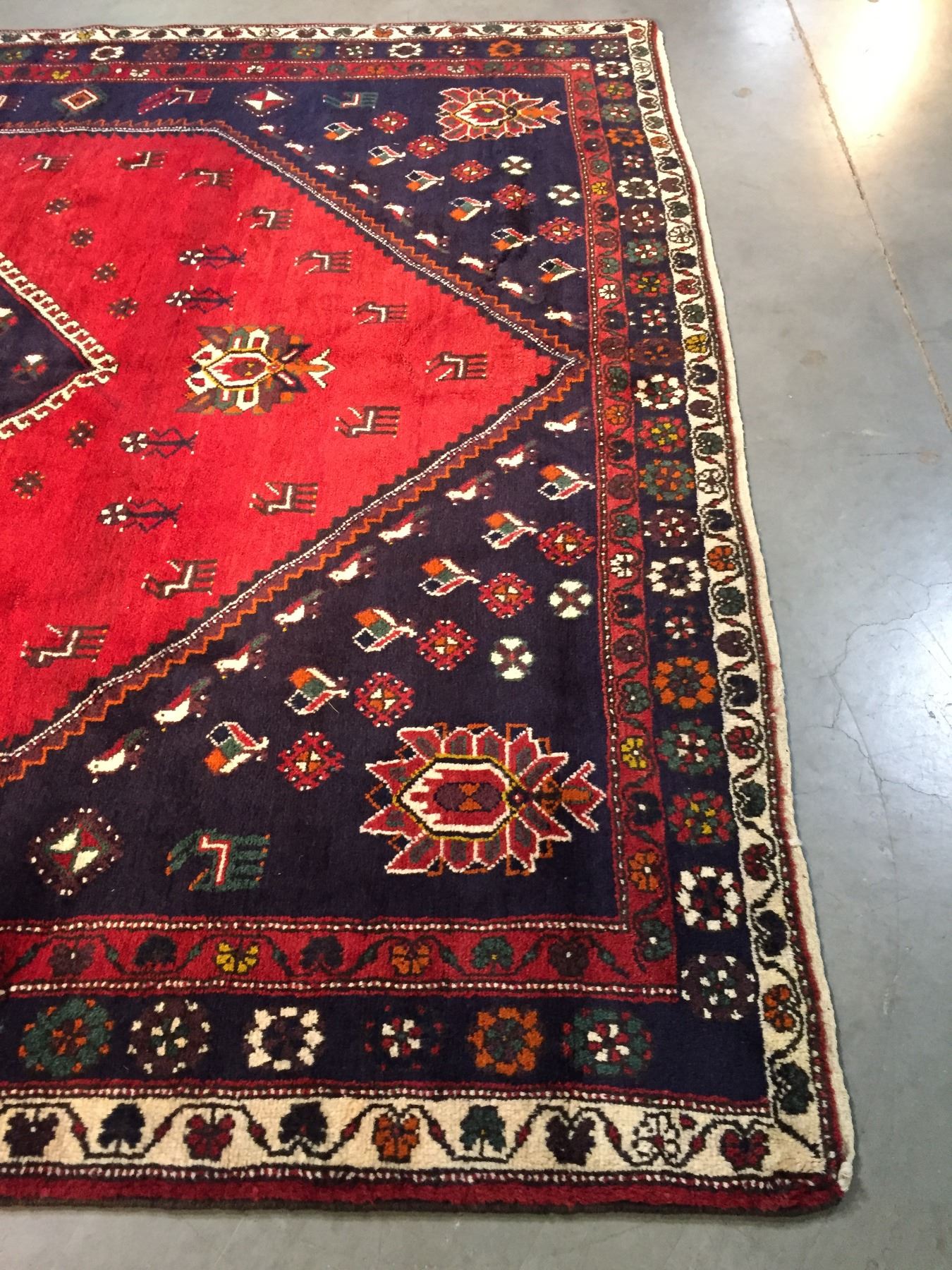 7'.1"x10'.1" Eye catching open field Authentic Persian Shiraz Lori , rug ,Deep rich red and multi accent colors 100% fine wool hand knotted in Iran.