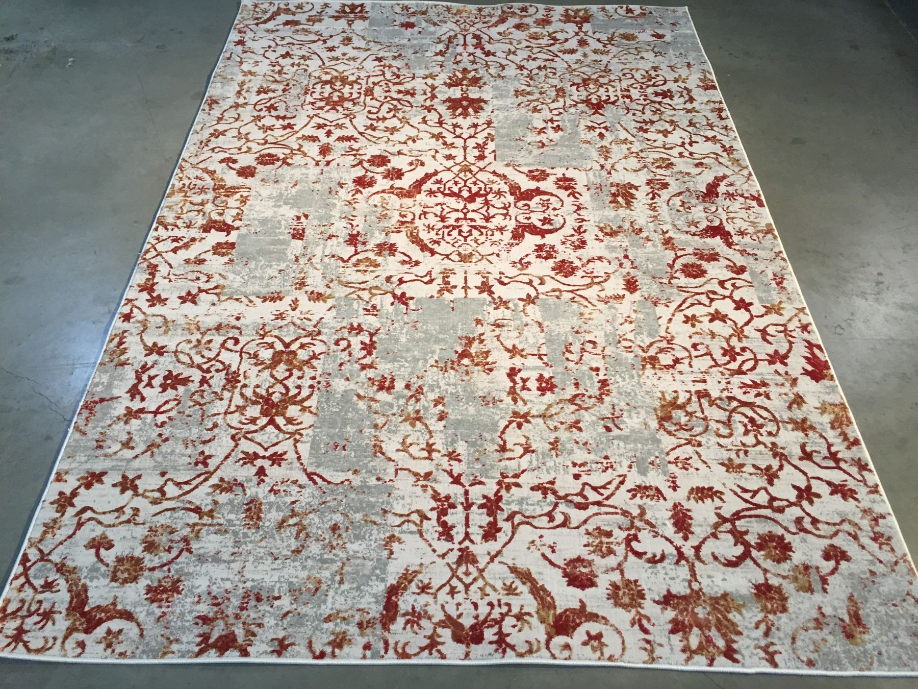 6.7x9.6 Designer, Brand name rug, stunning blend of traditional motifs with modern up to date colors and patterns in Ivory, Grey , copper colors ,Made of Bamboo silk and polyproplyen pile power loom in Turkey