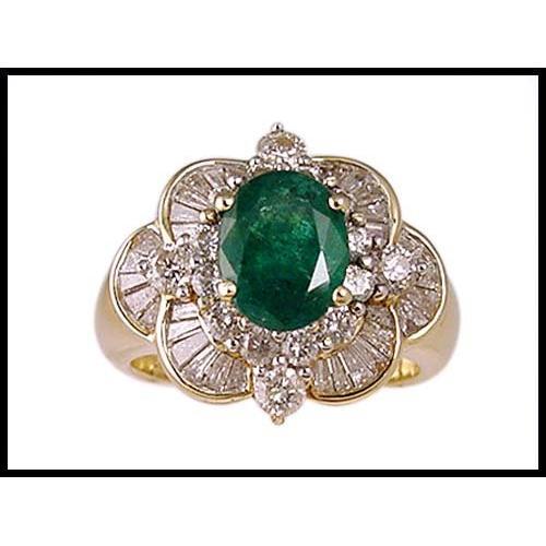 The photos do no justice to the pleasing deep rich color of the 1.45 carat natural emerald. 47 sparking baguette and full cut diamonds (over 1 1/2 carats total) are wonderful companions for the center emerald. This is an impressive ring on the hand. 8.0 grams of 14K solid gold have been worked by a true expert goldsmith who has created a very special ring. Size 7. The decorative portion measures 19mm (3/4") wide x 17mm (11/16") long. Would be priced at our famed estate sales at Bailey Banks and Biddle for only $4500.00, but you may own it now for just a fraction of that.