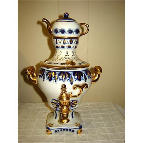 WOW...TRULY MAGNIFICENT. A VINTAGE, 1950'S VERSION OF A RUSSIAN SAMOVAR MADE BY THE VERY WELL-KNOWN GZHEL PORCELAIN FACTORY WHICH BEGAN MAKING HIGH-END PORCELAIN IN THE 17th CENTURY AND IS STILL MAKING PORCELAIN TO THIS DAY.