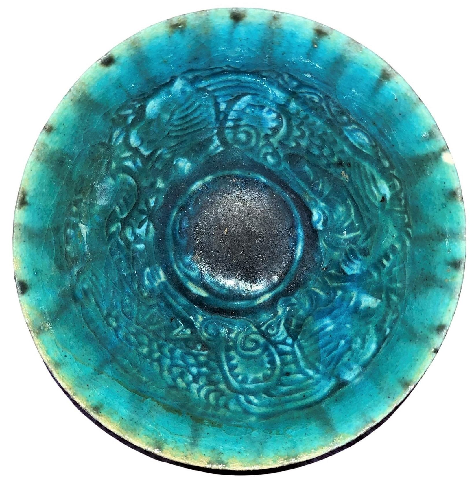 A very similar Bamiyan moulded rich deep turquoise glazed bowl with two lions chasing each other around the interior is in the Khalili Collection (Ernst J. Grube, Cobalt and Lustre, London, 1994, no.343, pp.302-3). Another example in the same collection is a simpler version of the same design, while a third shows the more usual composition of two lions both facing in the same direction (Grube, op. cit., nos.381 and 378, pp.318-319).