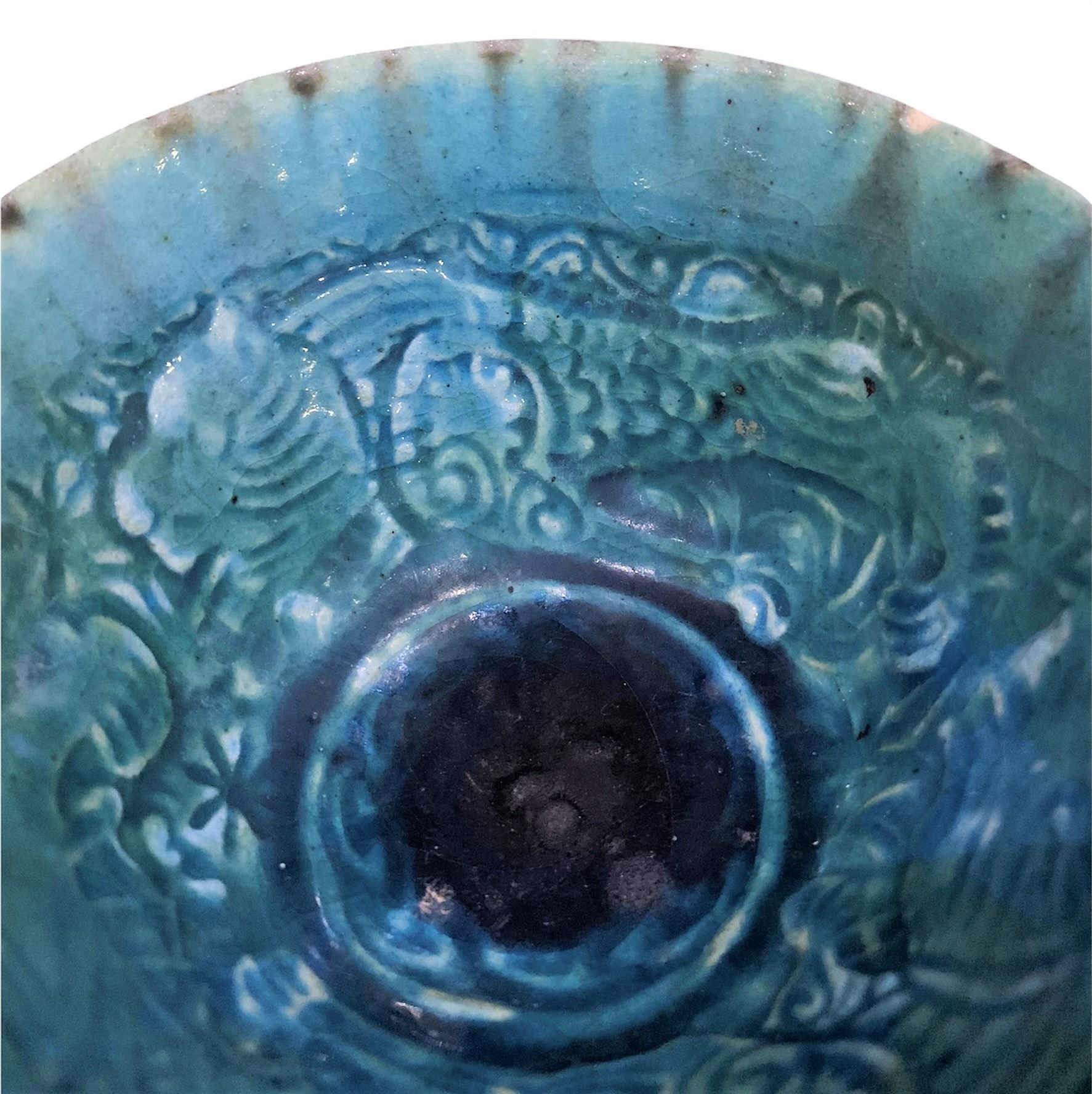 A VERY RARE & MAGNIFICENT INTACT ISLAMIC SELJUK TURQUOISE GLAZED BOWL WITH TWO LIONS, CIRCA 12TH-13TH CENTURY. KASHAN SELJUQ EMPIRE PERIOD, Of rounded form on short spreading foot, the interior moulded under the glaze with two large different lions prowling around the central roundel, on tight scrolling flowering and palmette vine ground, a line of manganese around the rim, the turquoise exterior with a band of manganese rope-pattern and occasional vertical stripes, intact These Turquoise glazed molded wares form a distinct group of pottery, unified by their fabric, shapes, techniques of making and decorating and their motifs. These wares are made in molds many examples of which have been excavated at very well preserved sites complete with intact kilns. They show ornament in relief on the interior of small bowls. During the manufacturing process, the bowls were stacked on tripods which left distinctive scars on the inside of the bowls. This bowl is decorated with a repetitive scrolling pattern and distinguished by its beautiful iridescence.