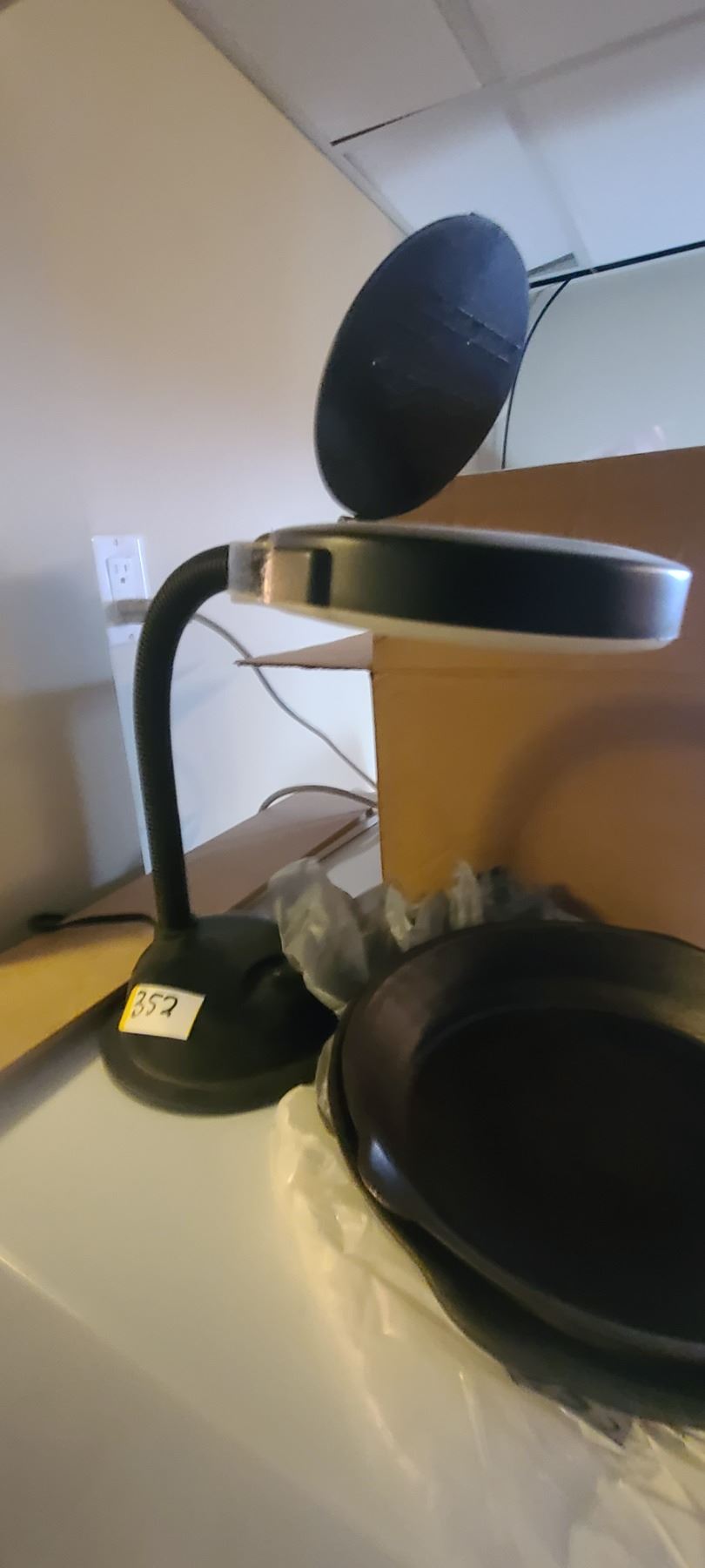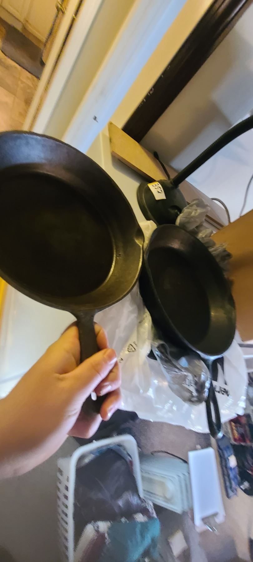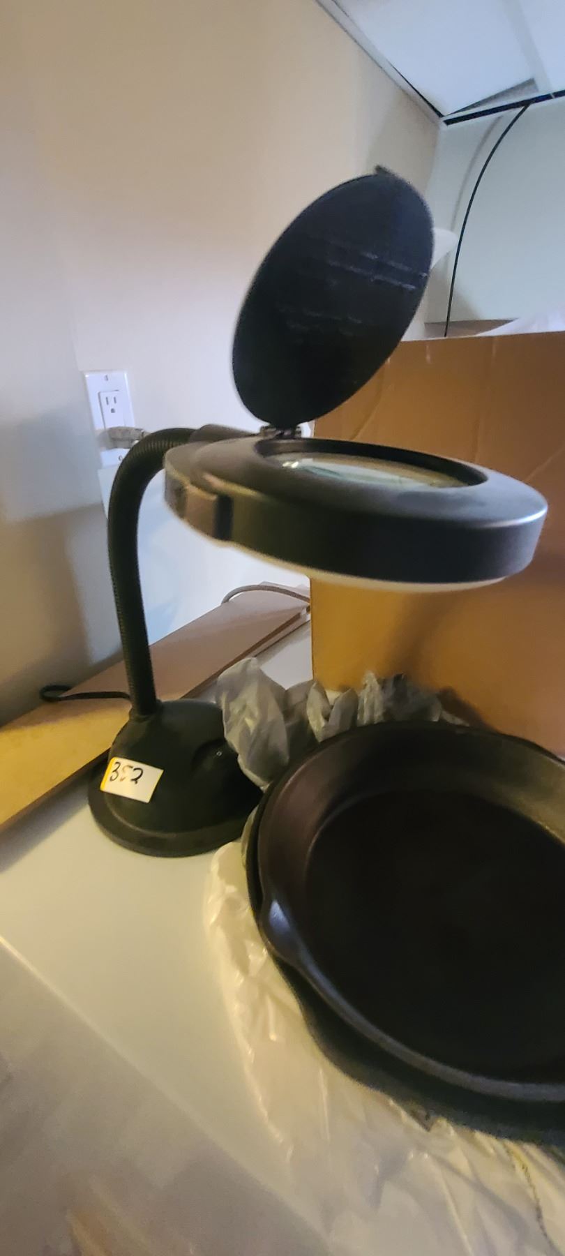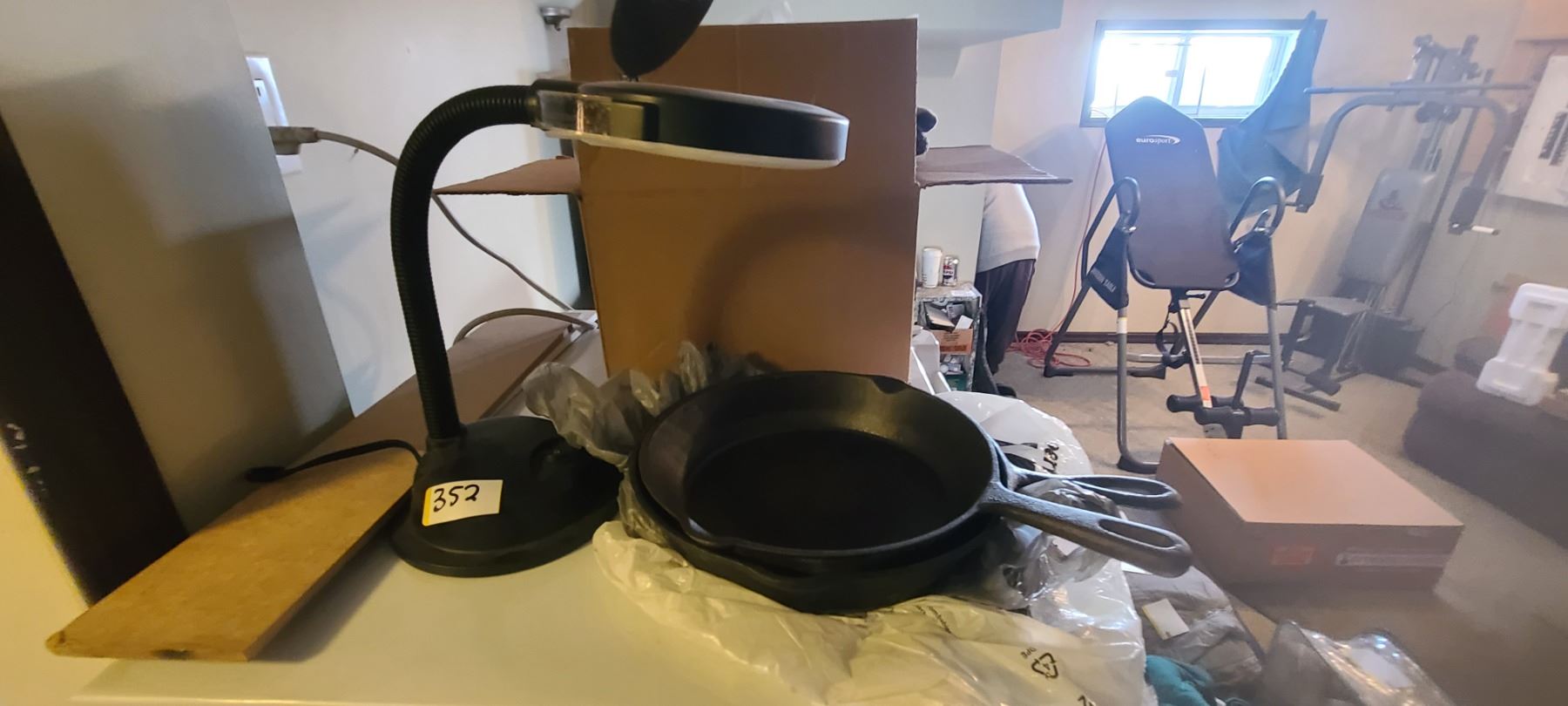 MAGNIFYING LAMP AND 2 CAST IRON PANS
