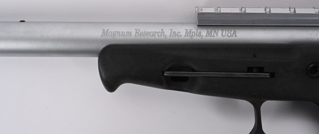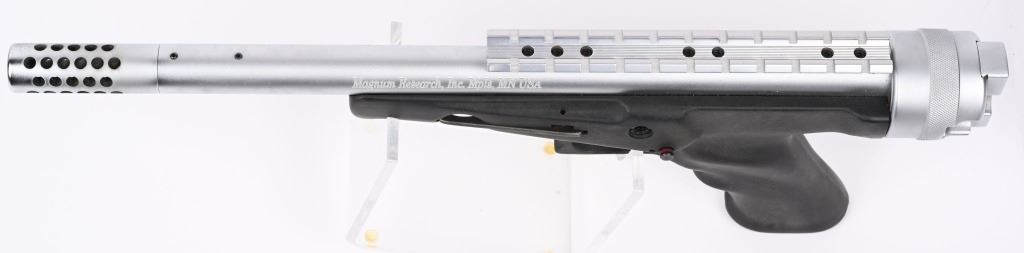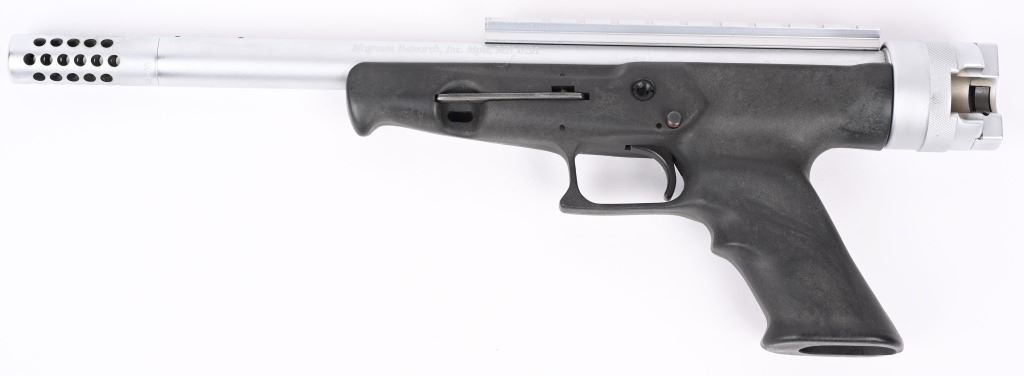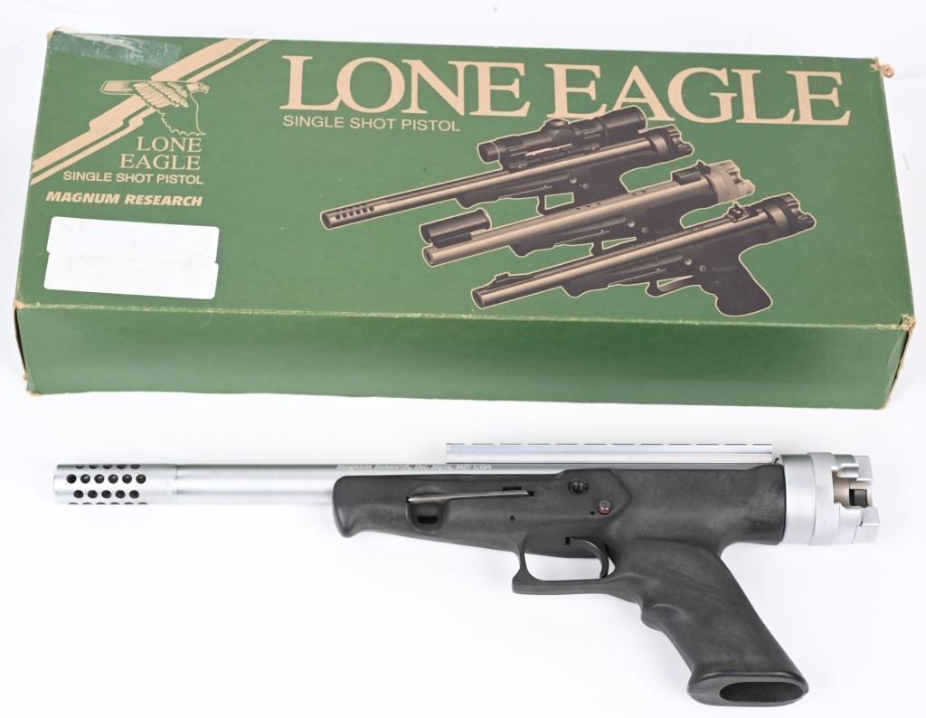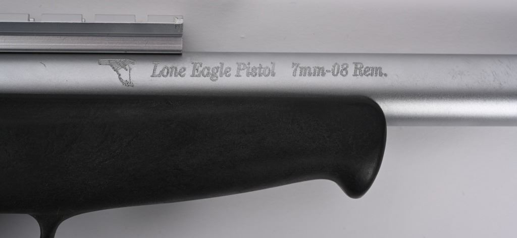 SERIAL NUMBER: A00985. BARREL: 14". CALIBER: 7MM-08. MANUFACTURED: 1990'S. Heavy bull barrel designed for target shooting and hunting. Threaded muzzle and ported muzzle break. Scope rail on the top of the barrel. Matte stainless finish and black polymer frame. Includes original box and Leupold FX-II 4X28MM Handgun scope. CONDITION: Metal is excellent overall, with a few handling marks. Frame is excellent as well. Bore is shiny with crisp rifling. Scope is excellent, with a clear optic. MODERN