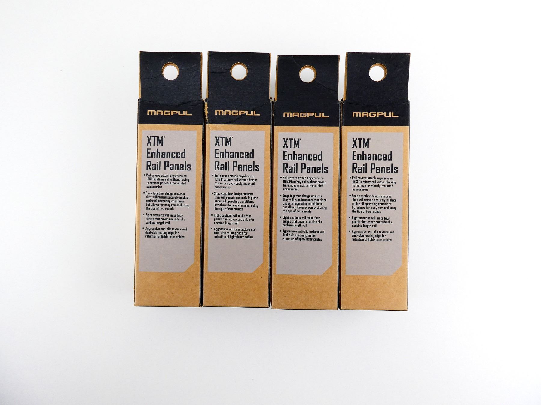 LOT INCLUDES; (4) PKGS OF XTM ENHANCED RAIL PANELS, ATTACH TO 1913 PICATINNY RAILS, EIGHT SECTIONS MAKE FOUR PANELS TO COVER ONE SIDE OF A CARBINE LENGTH RAIL, BLACK, APPEARS NOS IN ORIGINAL PACKAGING. MAY REQUIRE FITTING. SEE PHOTOS.