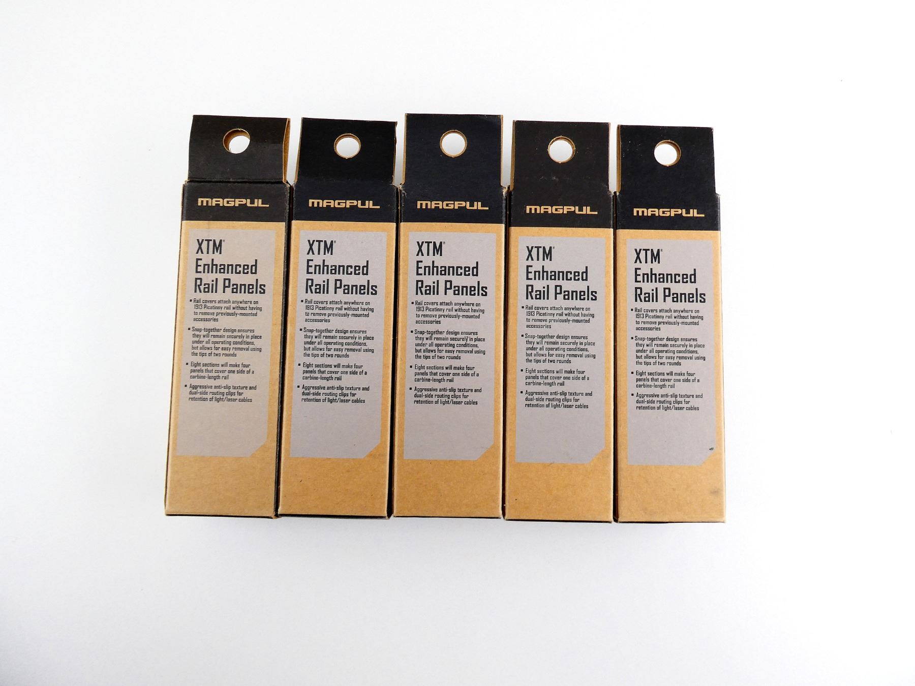 LOT INCLUDES; (5) PKGS OF XTM ENHANCED RAIL PANELS, ATTACH TO 1913 PICATINNY RAILS, EIGHT SECTIONS MAKE FOUR PANELS TO COVER ONE SIDE OF A CARBINE LENGTH RAIL, VARIOUS COLOURS, APPEARS NOS IN ORIGINAL PACKAGING. MAY REQUIRE FITTING. SEE PHOTOS.
