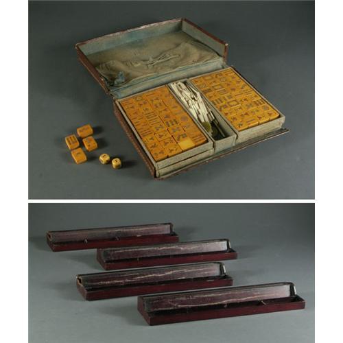 MAH JONG: A beautifully detailed Mah Jong set with 148 Bakelite tiles, dice, bone betting sticks, four wood tile trays, and original leather case, chips noted to several tiles, wear noted to case and tile holders, as seen.