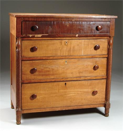 MAHOGANY AND MAPLE FEDERAL CHEST. One mahogany veneered drawer offset over three graduated maple drawers. Each fitted with two wood turned dark knobs. Side spiral carved half column, paneled sides. SIZE: 43-1/4in. h x 40-1/2in. x 20-1/4in. d. CONDITION: Veneer damage to top drawer area, one escutcheon missing. Fair to good. 9-26573