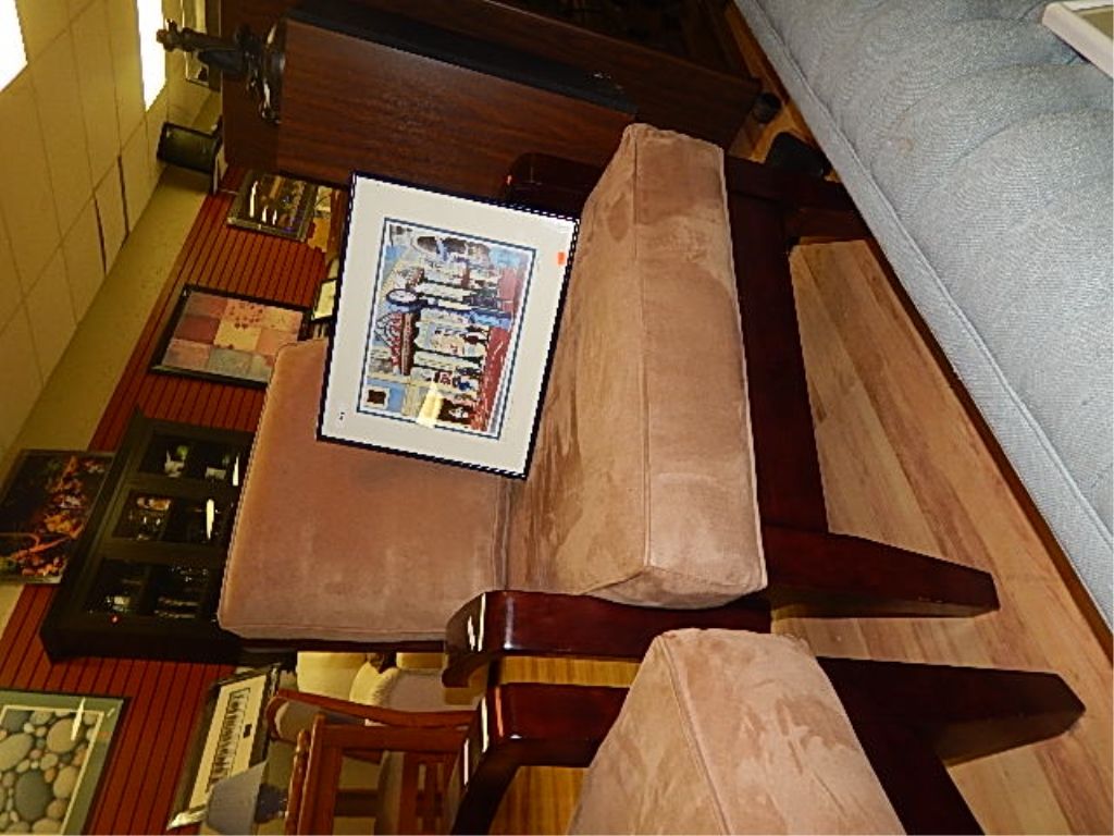 MAHOGANY AND MICROFIBER ARMCHAIR