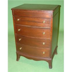 SMALL MAHOGANY 4 DWR. BACHELOR'S CHEST WITH LIFT TOP. Has compartment on top. French style feet. Light surface scratching on the top and water staining. 26.5"H, 18"W, 13.5" D.