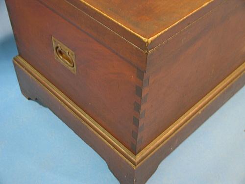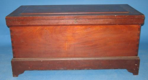 MAHOGANY BLANKET CHEST. Bracket feet. Dovetailed case. Missing brass handle at one side. Shows some surface scratching at feet. Shows surface scratching and water damage at top. 24.5" H, 49.5" W, 24.5" D