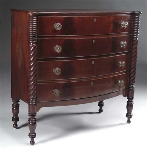 MAHOGANY BOW FRONT COOKIE CORNER FOUR DRAWER CHEST. Front 3/4 carved and turned posts terminating in well carved cookie tops. Ring turned with central spiral carving. The four drawers having nice mahogany veneers, brass decorated hardware and applied beaded edge. The case on high legs. Probably of Massachusetts origin. SIZE: 39-14” h case is 37-1/2” x 19” d. CONDITION: One ball foot has slice missing, otherwise very good. 9-27604