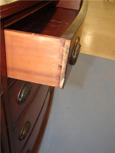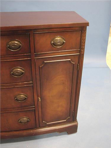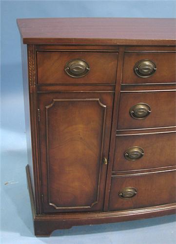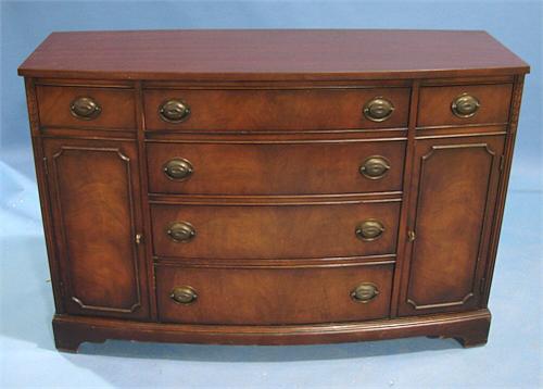 BERNHARDT FURNITURE CO., LENOIR, NORTH CAROLINA, MAHOGANY BUFFET. Three dovetailed drawers over three dovetailed drawers at center and doors at both sides. Bracket feet. Bow front. Marked with label on back. 35.5” H, 53” W, 19” D