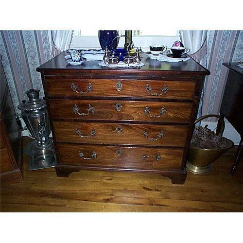 THIS IS A ONE OF A KIND, GEORGE III STYLE MAHOGANY 4 DRAWER CHEST...A VERY DESIRABLE PIECE! MADE IN ENGLAND CIRCA 1820, CHEST STANDS 31" HIGH 36" ACROSS AND IS 20" DEEP. LOVELY, ORIGINAL BRACKET FEET. BRASS HARDWARE. TOP DRAWER LOCK IS MARKED: LEVER; HOBBS & CO. LONDON M4. LOCK IS NOT ORIGINAL TO THE PIECE, WOULD DATE TO CIRCA 1890- 1910. I HAVE NO KEY, BUT THESE ARE EASY TO FIND. ONLY THE TOP DRAWER HAS A LOCK; IN REMAINING DRAWERS, MECHANISM HAS BEEN REMOVED. I HAVE DESCRIBED THE CONDITION OF THE PIECE AS GOOD; LET'S REMEMBER THIS IS A PIECE THAT IS OVER 185 YEARS OLD! I WILL CAREFULLY DETAIL ANY "IMPERFECTIONS". THERE IS AN OLD REPAIR TO THE TOP LEFT SIDE OF THE PIECE (see 3RD photo) AND WHAT APPEARS TO BE AN OLD BURN MARK WITH SOME CRAZING. 3 LIGHT SPLITS APPEAR ON THE TOP SURFACE, MEASURING 2"-6" IN LENGTH. THERE IS ALSO A VERY OLD REPAIR ON THE TOP, WHICH HAS BEEN DONE IN THE SHAPE OF A HEART; OBVIOUSLY A PIECE GIVEN TO SOMEONE CHERISHED (SEE 2ND PHOTO). THE LAST PHOTO SHOWS THE DOVETAILS ON THE DRAWERS; NICELY WORKED. THE COLOR OF THE MAHOGANY HAS A SUPERB AGED 'GLOW' TO IT. ADDITIONAL PHOTOS ARE AVAILABLE UPON REQUEST. WE ARE WELL EXPERIENCED IN PACKING/SHIPPING WORLDWIDE, WHICH IS NOT EXPENSIVE FROM MONTREAL, CANADA.