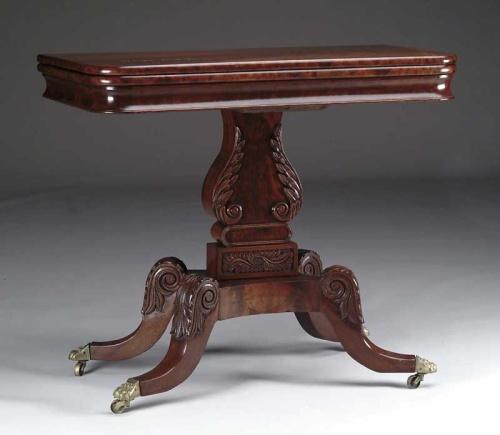 MAHOGANY CLASSICAL CARVED LYRE CARD TABLE. The rounded corner veneered top swivels with open interior. The center support in a thick lyre form edged with scrolled leaves over a rectangular block with leaf carving. The quatrefoil base supported by four outstretching legs with heavy scrolled leaf carving ending in brass paw caster feet. SIZE: 29-1/2” h x 34” w x 17-1/4” d. CONDITION: Some veneer repairs, generally good. 9-27588