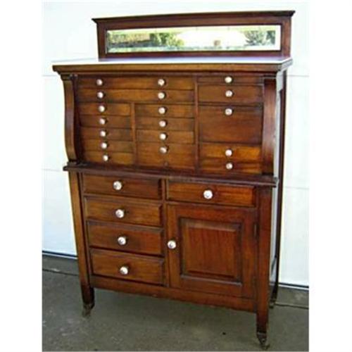 This is a beautiful old mahogany dental cabinet, all original, including the casters, mirror and marble top. In fact, it still smells like an old dentist office. It has plenty of drawers, and a cubby or two, and would be nice for jewelery, scarves, linens or many other collectables or items. It is extremely well made with a paneled back and has at least two labels in it. The only thing missing is the small glass insert that was used to mix filling material and of course that would be VERY easy to replace if it was important to you. This came from Michigan and is on of the nicest dental cabinets that I have seen. I am sure that you would be very pleased with this piece.