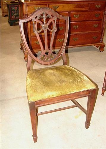 MAHOGANY SHIELD BACK DINING CHAIR. Has green upholstered seat. 37.75" H to top of back.