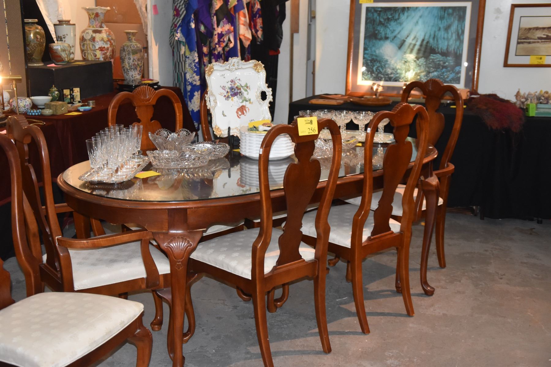 MAHOGANY DINING SUITE W/DINING TABLE, 1 LEAF, GLASS, 2 ARM CHAIRS & 6 SIDE CHAIRS