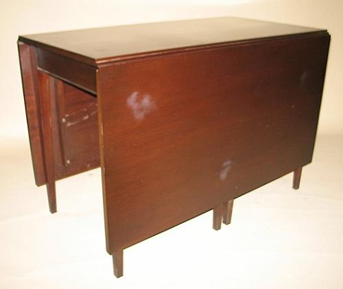 MAHOGANY DROP-LEAF DINING TABLE. In the style of Henkel-Harris. Tapered legs. Minor surface scratching at top. Water damage at leaves. 30.5” H, 44” L, 24” W. Each leaf: 24” W