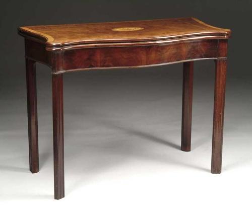 MAHOGANY GEORGE II SERPENTINE FRONT CARD TABLE. The fold over shaped top with replaced green felt over a serpentine front mahogany veneer frieze supported by three fixed legs and one swing leg. The front legs are chamfer carved on three sides. The back legs only on outside. The fold over top surface has outside inlaid band and central oval with decorative shell, which is a later addition. SIZE: 29” h x 37-1/2” w x 18-1/4” d. CONDITION: Repaired splits in top veneer otherwise very good. 9-27080