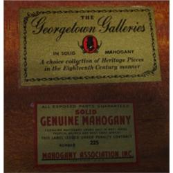 MAHOGANY GEORGETOWN GALLERIES FLIP-TOP GAME TABLE. Single drawer. Labeled on inside of drawer. Good overall condition. 31.25" H, 36" W, 18" D